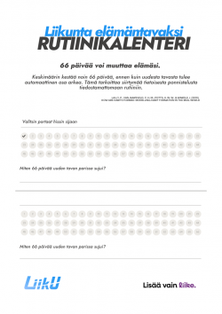 Valitse yksi pieni ja helposti toteutettava tapa, joka sopii arkeesi ja vie sinut kohti aktiivisempaa elämäntapaa. Esimerkkejä: