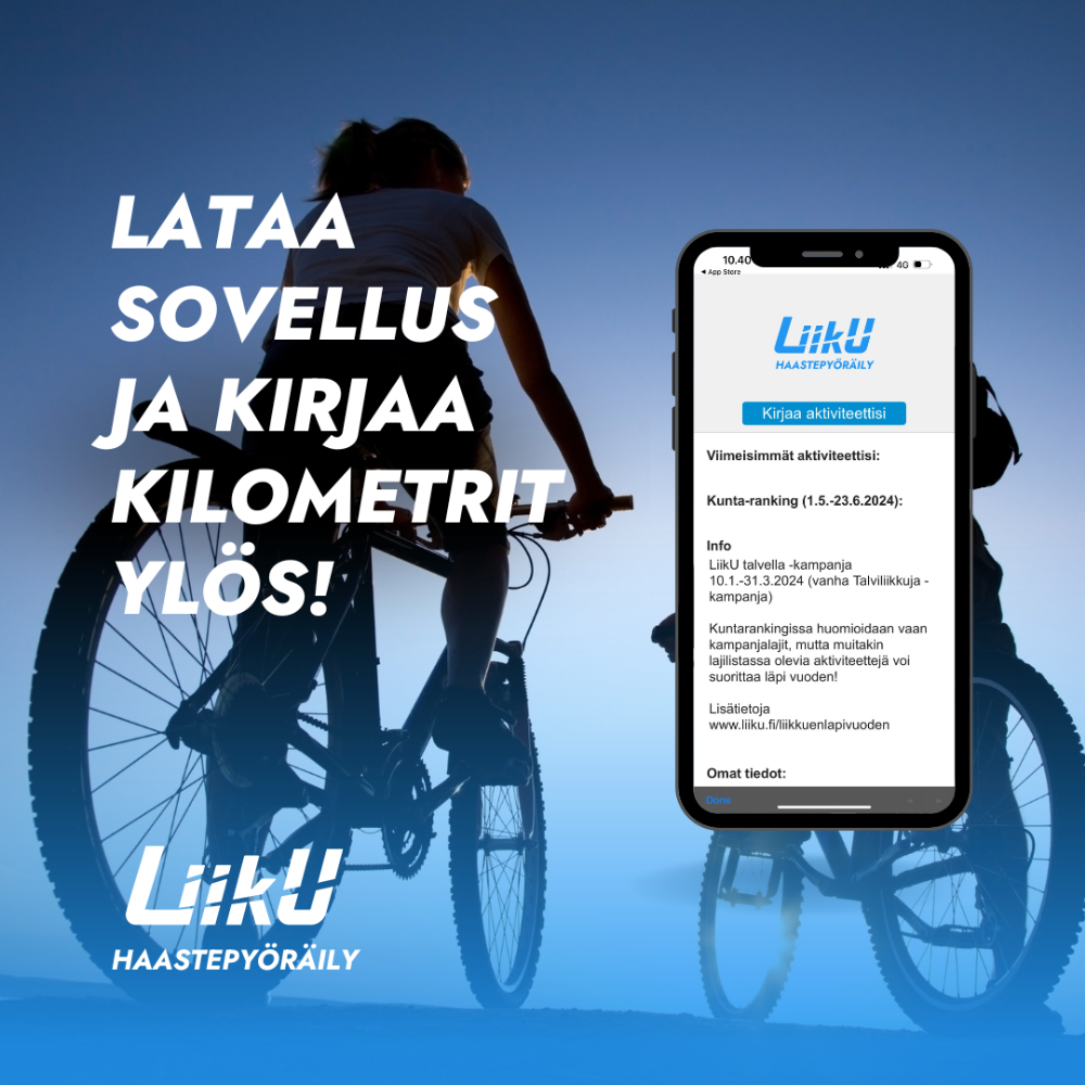 LiikU Haastepyöräily -kampanja järjestetään 1.5.-23.6.2024 ja kirjauksia voi tehdä pyöräillen eri pyörillä kuten, sähköpyörä, maastopyörä, citypyörä, hybridipyörä, cyclocrosspyörä, laatikko-pyörä, soveltavan liikunnan pyörät, tandempyörä, kickbike omien kilometritavoitteiden mukaan.