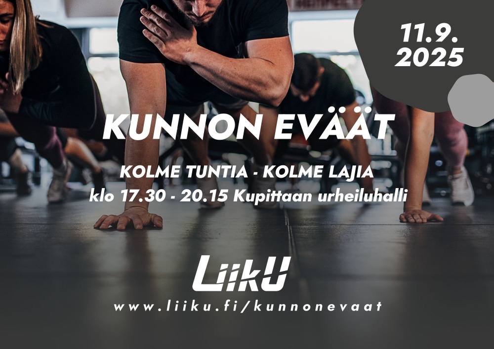 Kolme tuntia - kolme lajia - reilusti hyvää fiilistä!Kunnon Eväät on työikäisille ja etenkin työyhteisöille tarkoitettu liikuntatapahtuma, jonne voit tulla yksin, kaverin kanssa tai keräämällä isompi porukka työpaikaltasi. Illan aikana jokainen osallistuja pääsee valitsemaan kolme kiinnostavaa lajia yli 20 vaihtoehdon joukosta. Ehkä löydät uuden harrastuksen, jonka parissa jatkat vielä tapahtuman jälkeenkin!
