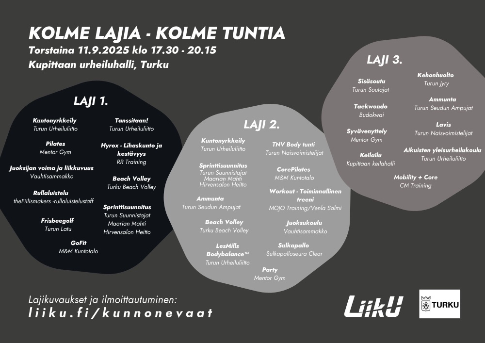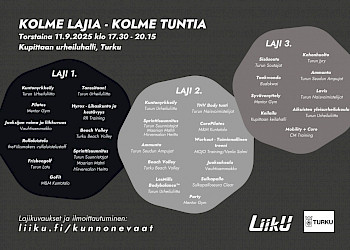 Kunnon Eväät on syksyn liikuntakauden avaustapahtuma. Lämmin kiitos kaikille vuoden 2025 tapahtumaan osallistuneille. Palautteet sen kertovat, te olette arvioineet tapahtuman arvosanaksi 4,4/5!! Lähes kaikki ovat valmiita suosittelemaan tapahtumaa ystävilleen. Kiitos palautteista!