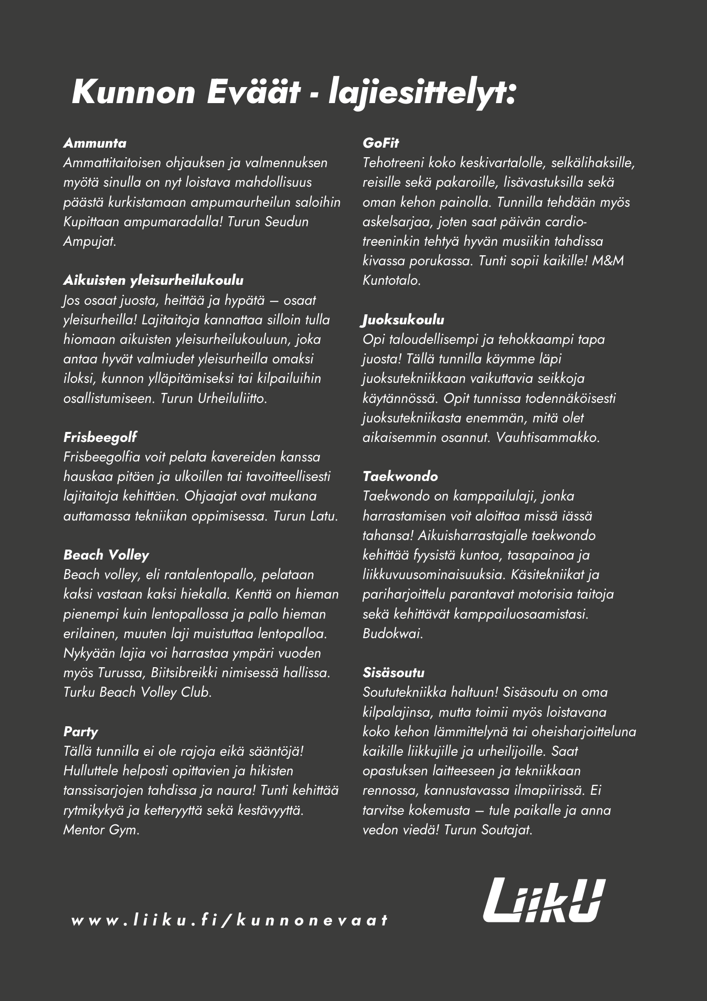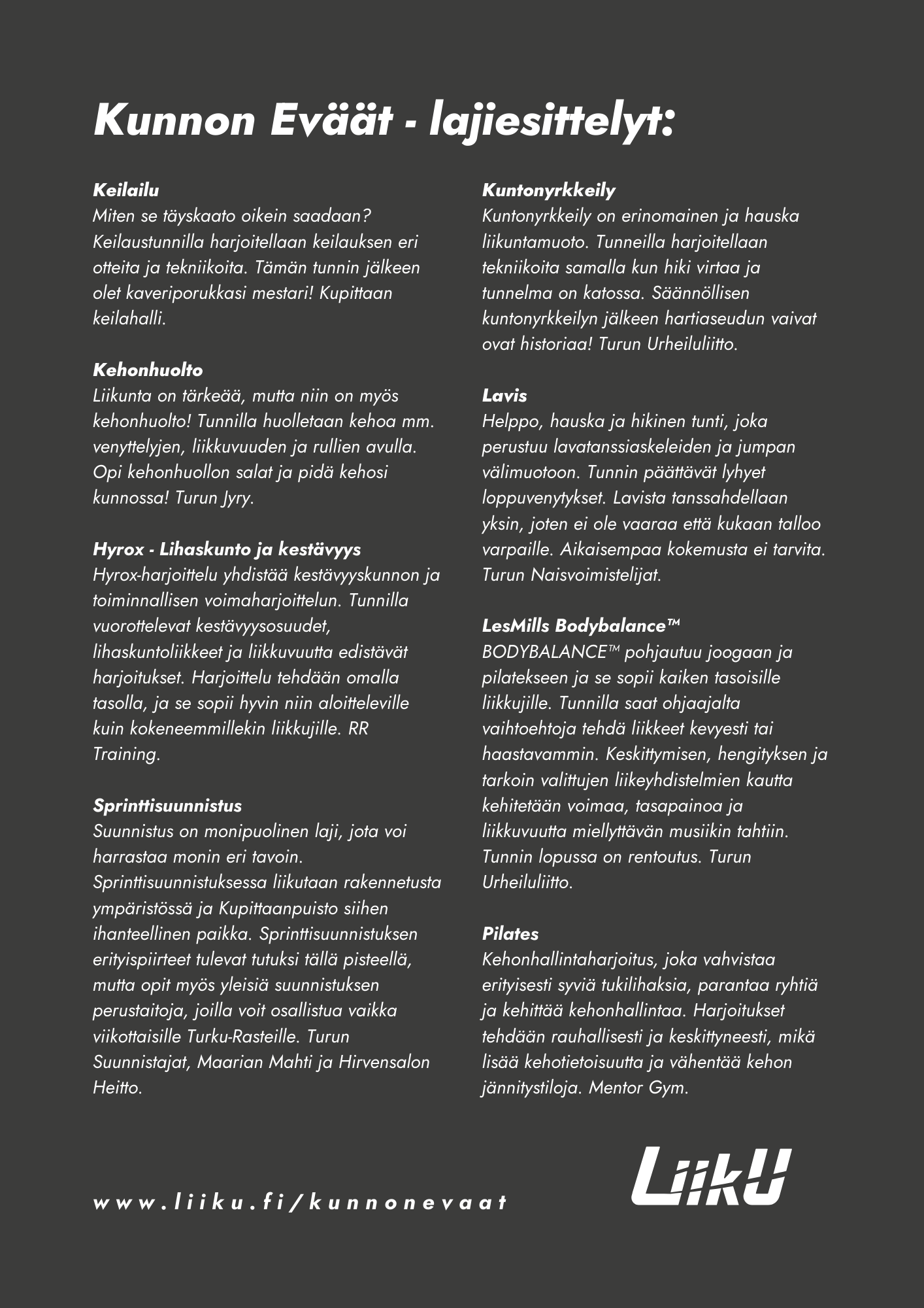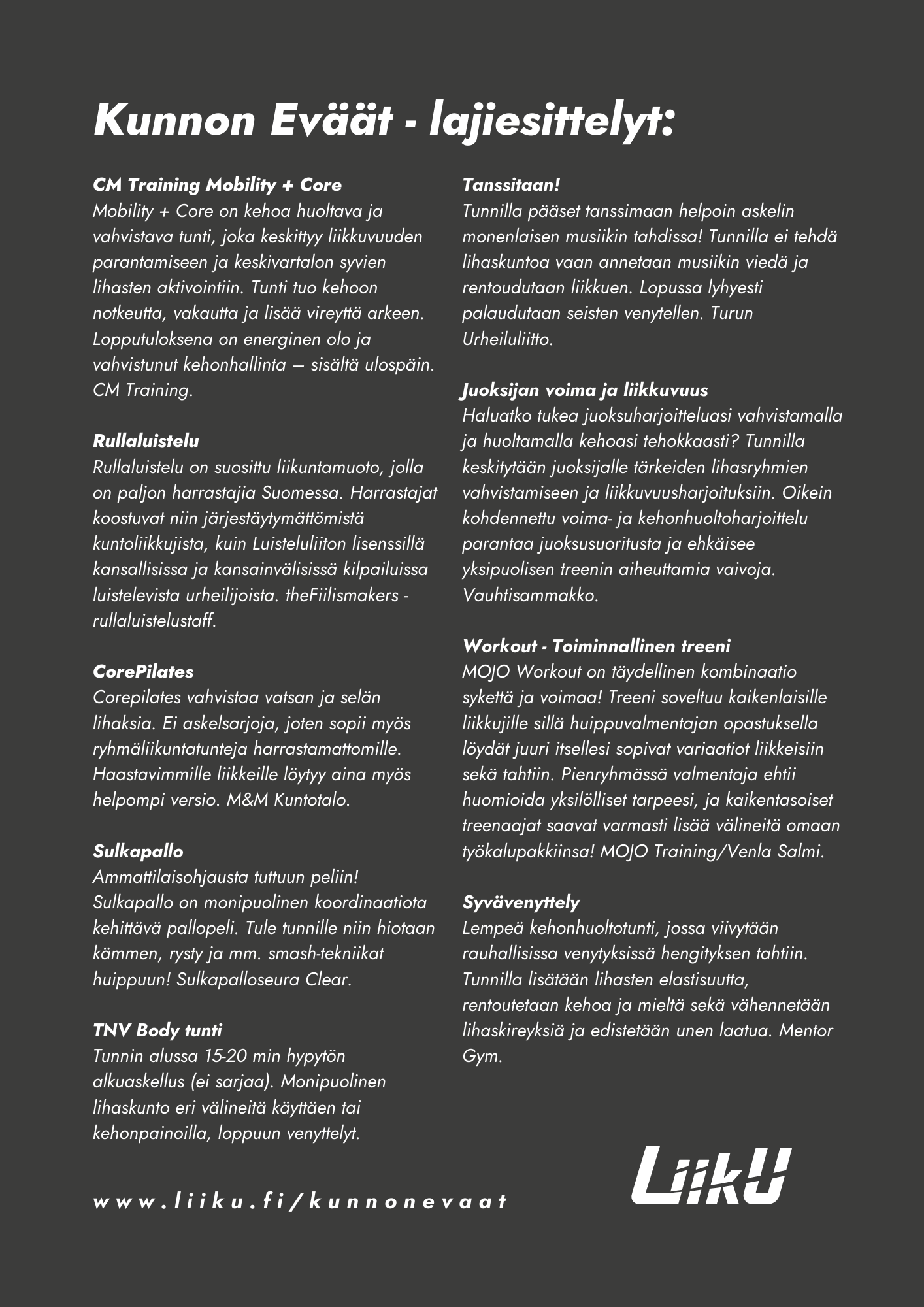 Kunnon Eväiden lajikattaus on laaja. Voit räätälöidä oman Kunnon Eväät tapahtumasi ja valita jokaiselta tunnilta yhden lajin. Tervetuloa liikkumaan!
