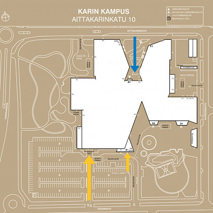 Juhlimme Rauman Karin kampuksella, jonne saavutaan Aittakarinkadun puolelta. Jos tulet autolla, tulee sinun ajaa Sahankadun puolelta kampukselle. Sahankadun puolella on iso ulkoparkkipaikka, mutta vaihtoehtoisesti voi myös ajaa parkkihalliin. Kulku parkkihalliin ja parkkipaikalta sisäänkäynti merkitty keltaisilla nuolilla. Parkkipaikalta ja -hallista on opastus juhlatilaan.