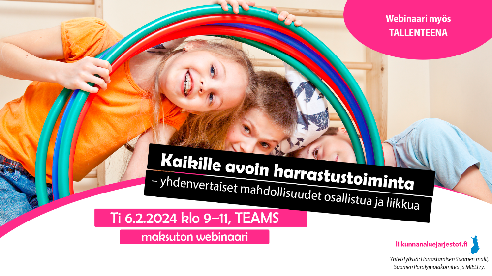 Liikuntatilassa soljuu kolmikielinen puheen sorina. Muutama istuskelee penkillä, osa liikuskelee ja kirmailee taukoamatta. Joku kurkistelee verhon takaa. Peli- ja leikkitilanteet herättävät suuria tunteita suuntaan ja toiseen. Kuulostaako tutulta? Ilmoittaudu mukaan! Webinaarissa saat tietoa ja käytännönvinkkejä, miten ohjaajana tai toiminnan järjestäjänä huomioit erilaiset liikkujat.