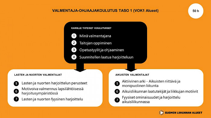 Koulutuskokonaisuus (50 h) koostuu suuntautumisen mukaan teemakoulutuksista sekä niihin liittyvistä itsenäisistä opinnoista. Osallistuja voi suuntautua joko lasten ja nuorten liikunnan tai aikuisliikunnan ohjaamiseen. Valmentaja/ohjaaja voi oman kiinnostuksensa mukaan osallistua vain yksittäisiin teemakoulutuksiin tai suorittaa koko VOK-1-kokonaisuuden. Koulutukset voi suorittaa haluamassaan järjestyksessä.