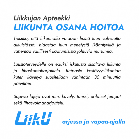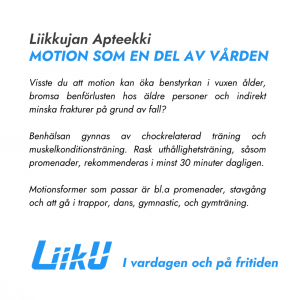 Some-paketti on Liikkujan Apteekeille ilmainen. Päivityksiä on tällä hetkellä saatavilla, vuoden 2025 helmikuulle saakka. Some-päivitysten avulla on helppo tuoda terveysliikunta- asiaa esille asiakkaille. Päivitykset ovat kuvamuodossa, ja päivityksen alle voi kirjoittaa omaa vapaavalintaista tekstiä, mainostaa omia tuotteita tai Liikkujan Apteekkia, ja tottakai tägätä hastageilla niin #LiikU kuin #Liikkujan Apteekki. Päivitykset ovat saatavilla sekä suomeksi että ruotsiksi ja alta näet esimerkkikuvat päivityksestä.