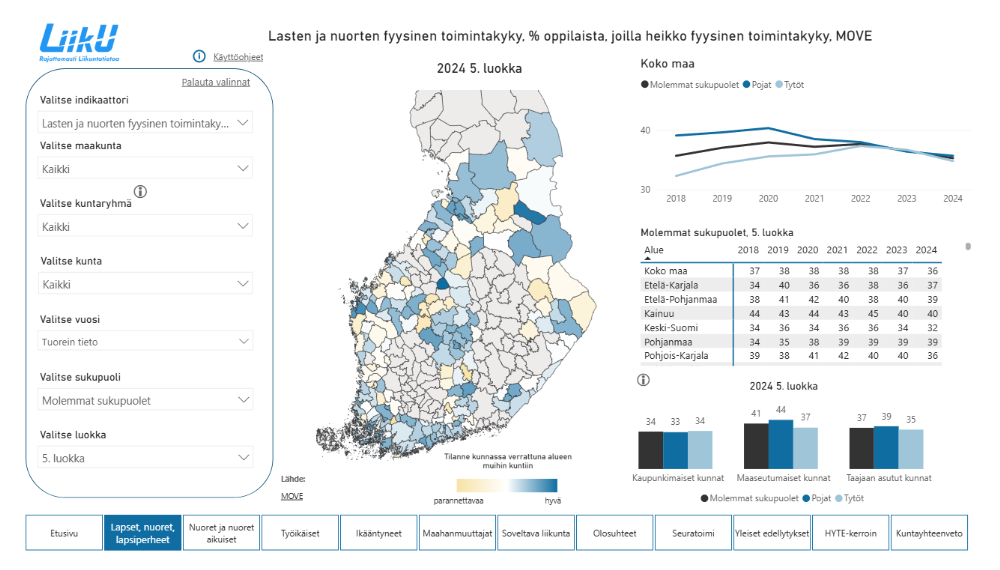Rajattomasti liikuntatietoa -alustalta löytyy liikunnan indikaattoritietoa eri kohderyhmistä, olosuhteista, seuratoiminnasta, yleisistä edellytyksistä sekä liikunnan hyte kertoimet.